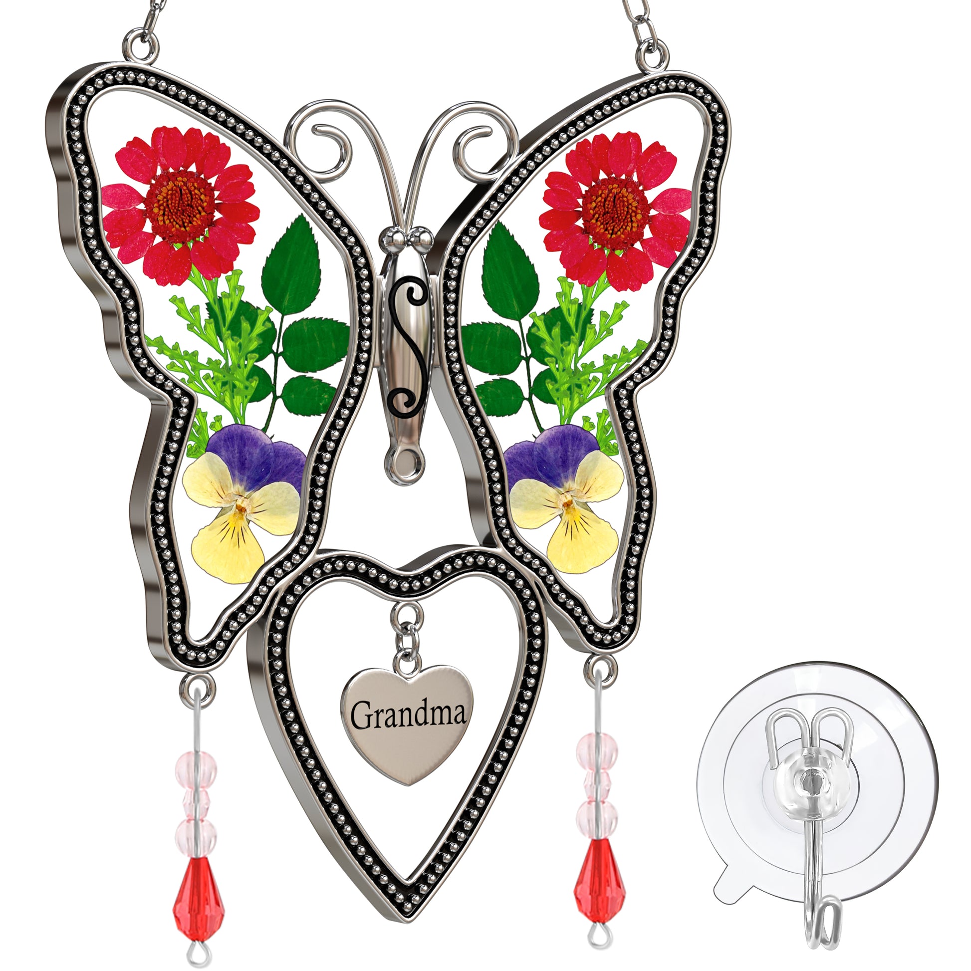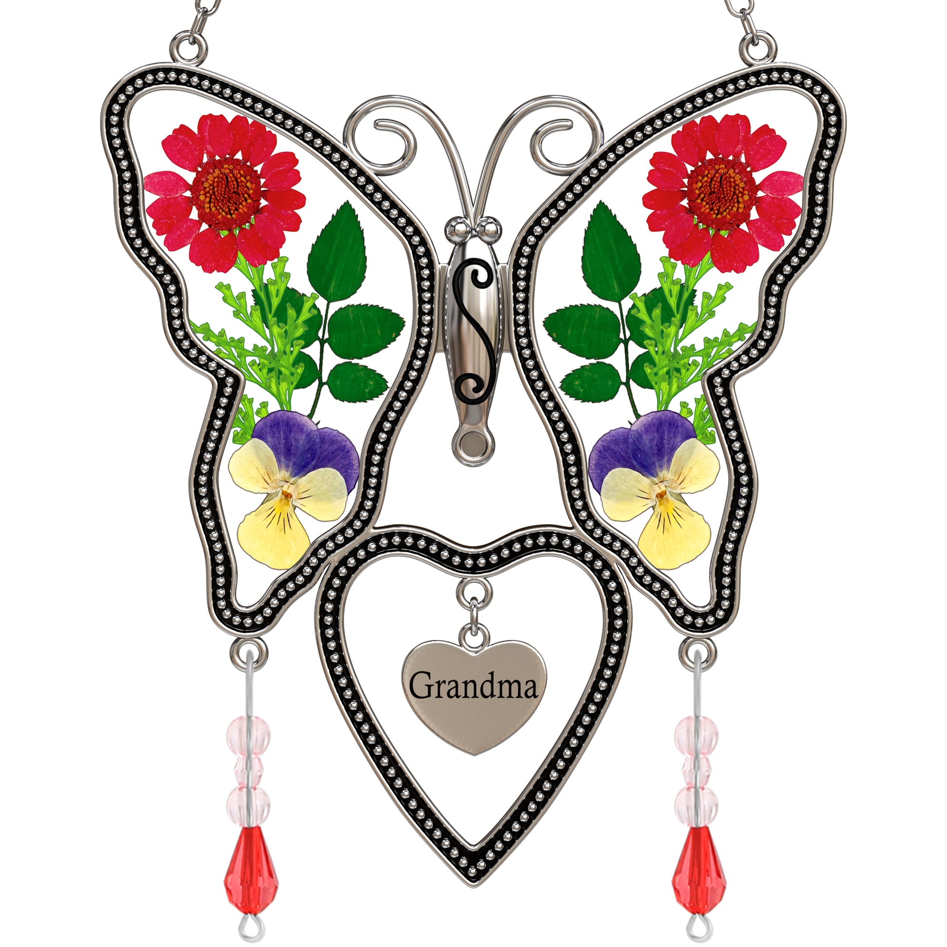 Grandma Butterfly Suncatcher with Real Pressed Flowers – Window Hanging Gift
