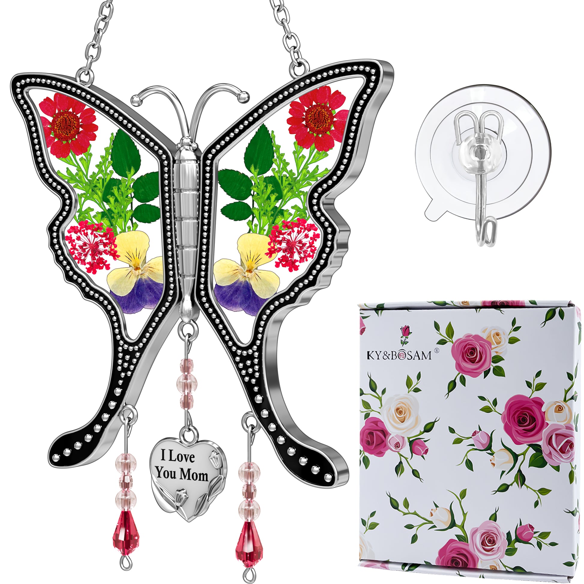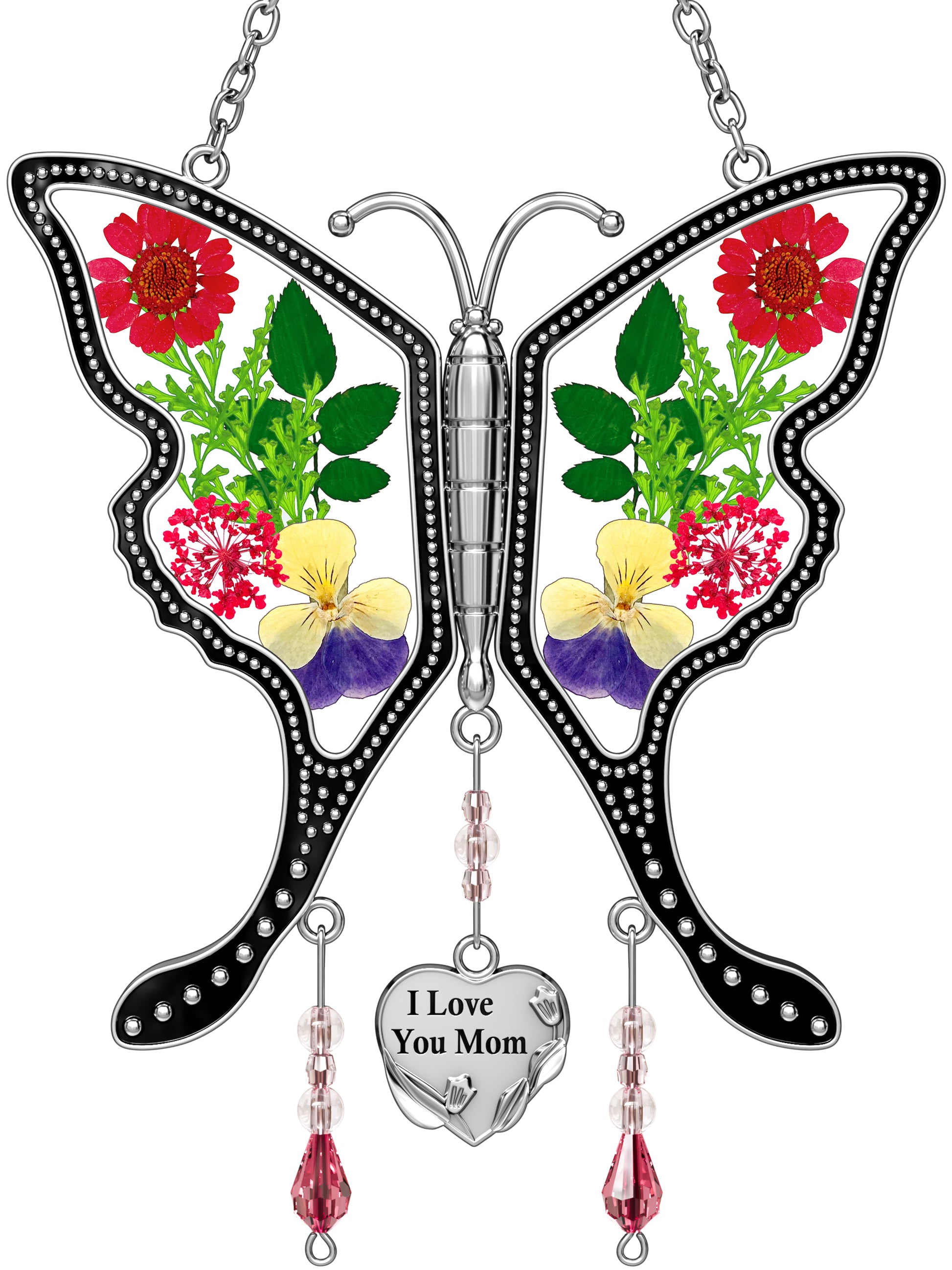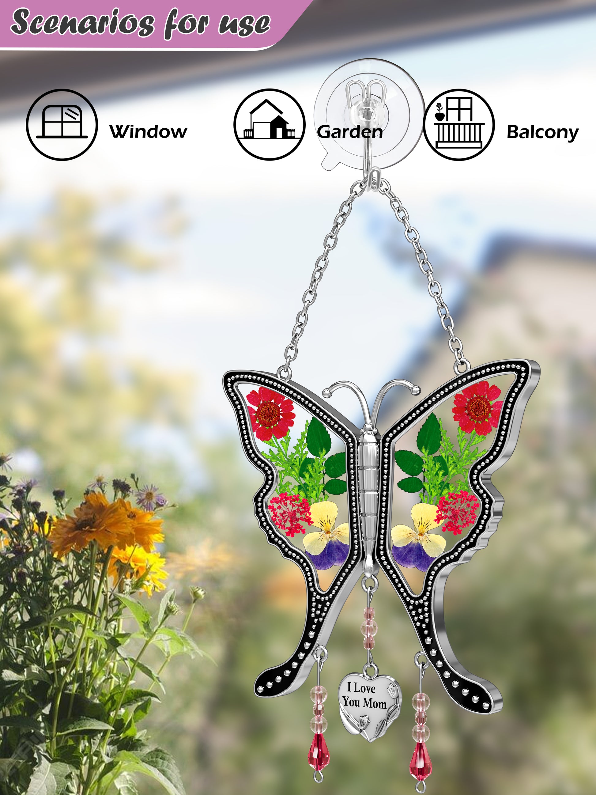 "I Love You Mom" Butterfly Sun Catcher – Handmade Glass Ornament with Real Flowers